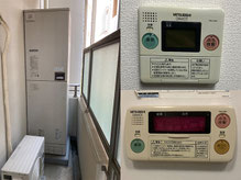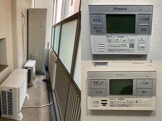 大阪府大阪市東成区のマンションにて電気温水器からエコキュートへ取替え(交換)工事をいたしました。三菱電気温水器460Lエコオート SRT-4668CFU-BL から、ダイキンエコキュート460Lオートパワフル高圧 EQA46YSV へ交換をしました。年間給湯効率3.5、給湯省エネ2025事業補助金対象機種です。電気温水器からエコキュートへの取替えは撤去加算もありお得に交換ができます。