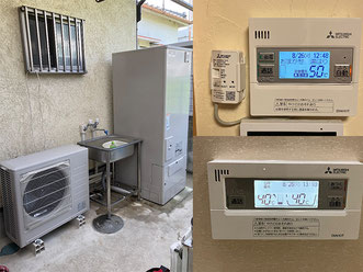 大阪府東大阪市の戸建て住宅にて電気温水器からエコキュートへ取替え(交換)工事をいたしました。三菱電気温水器370Lフルオート SRT-J37W3 から、三菱電機エコキュート370Lフルオート SRT-S376 へ交換をしました。UV-LEDユニット搭載のエコキュートで湯はり後にきれいなお湯をキープする循環運転を実施することで、ふろ配管を通るお湯に深紫外線を照射し菌の増殖を抑制するキラリユキープ機能付きです。年間給湯効率3.8、給湯省エネ2025事業補助金対象のエコキュートです。