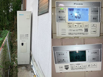 大阪府河内長野市の戸建て住宅にてエコキュート薄型タンクの取替え(交換)工事をいたしました。ナショナル370Lフルオート HE-37W1Q から、ダイキン370Lフルオート EQA37ZFTV へ交換をいたしました。最大使用圧力330kPaのパワフル高圧なのでシャワーの勢いがよく、おふろやキッチンなど2カ所で同時にお湯を使っても快適に使用できます。年間給湯保温効率3.0、給湯省エネ2025補助金対象のエコキュートです。